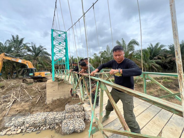 Aceh Tamiang – Satuan Tugas Batalyon Zeni Tempur 10 Kostrad melaksanakan renovasi jembatan gantung di Kampung Tebing Tinggi, Kecamatan Tenggulun, Kabupaten Aceh Tamiang, Rabu (18/02/2026).