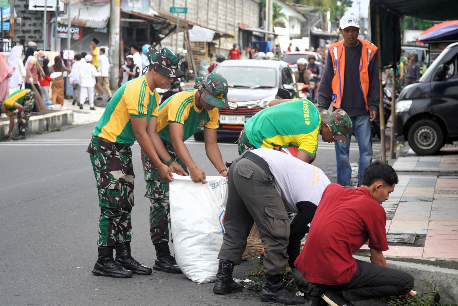 Prajurit TNI bersama petugas DLH dan para pelajar tampak penuh semangat membersihkan sampah, merapikan lingkungan, serta memastikan area fasilitas umum dalam kondisi bersih dan nyaman bagi masyarakat.