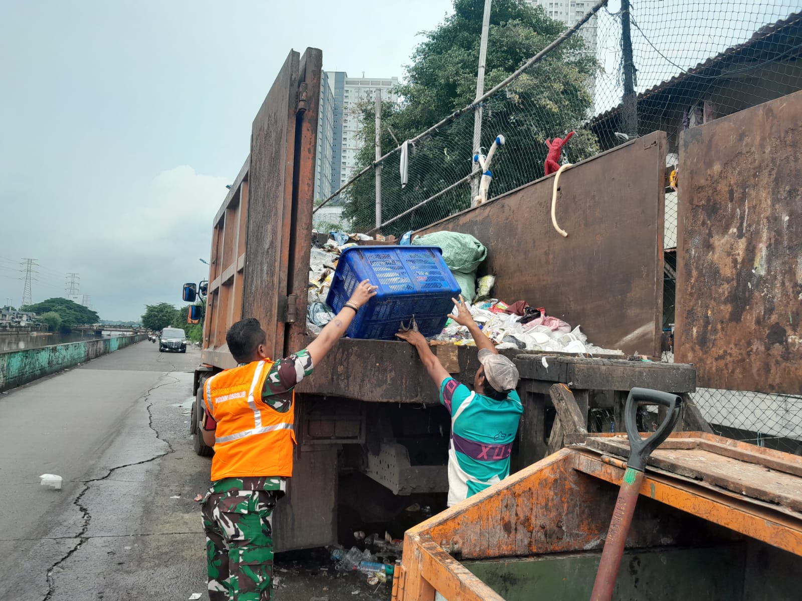 Jl Insfeksi Kali Grogol RT 004/01 Kel Tanjung Duren Utara Kec Grogol Petamburan Jakarta Barat,Satgas Sampah Kodim 0503/JB dan Komduk juga mengangkuti seluruh sampah hingga lokasi tersebut bersih.