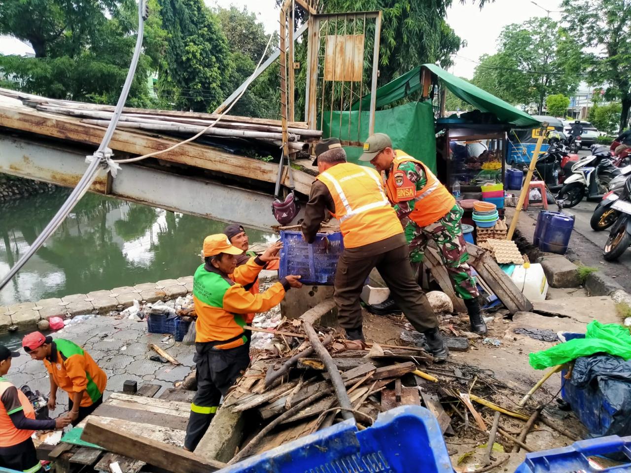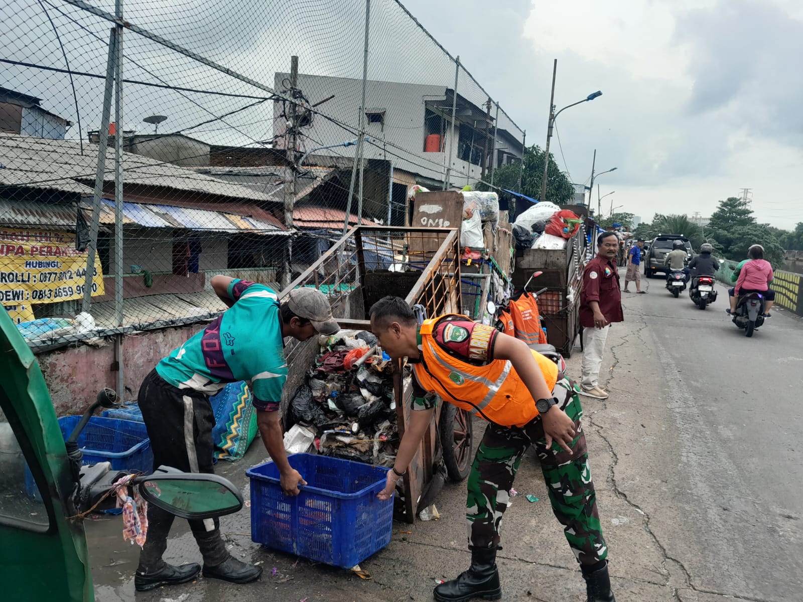 Di wilayah tiga Koramil tersebut petugas Satgas dan PPSU serta masyarakat juga membersihkan sampah yang nampak bertumpuk dengan peralatan