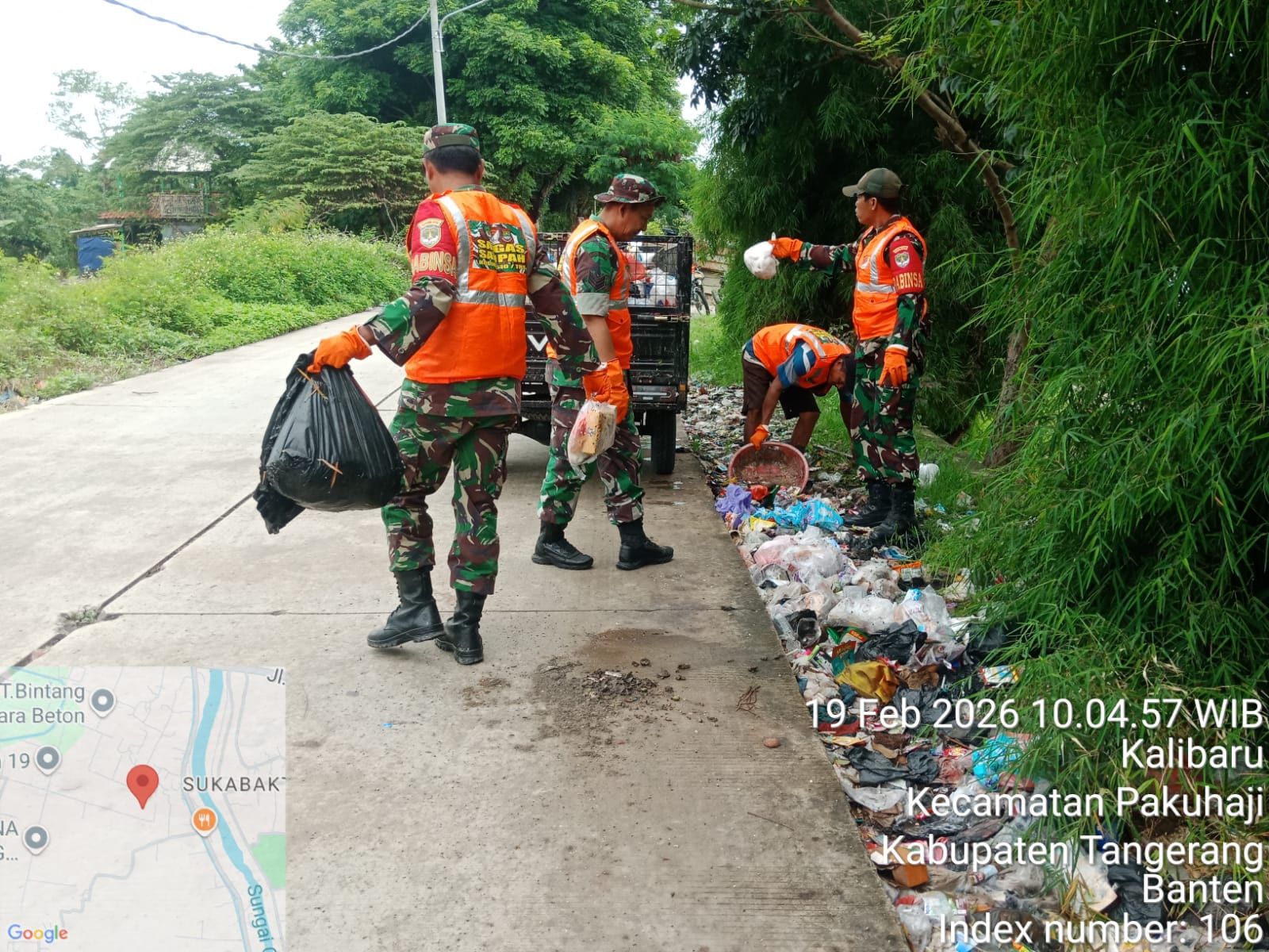 Kali ini Satgas Sampah Koramil 01/Teluknaga Kodim 0510/Tigaraksa, kembali turun ke jala untuk membersihkan sampah yang menumpuk di wilayah Kp. Sukabakti Rt 05/04 Desa Tanjung Burung Kec. Teluknaga Kab. Tangerang,Kamis, 19 Februari 2026.