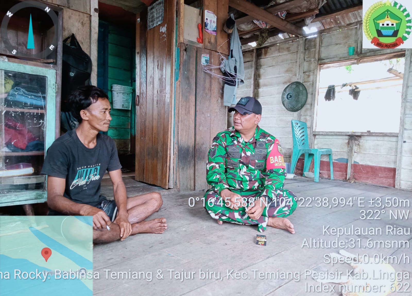 LINGGA — Babinsa Desa Tajur Biru, Serma Rocky, bersama Kepala Dusun II Pulau Batang, Bapak Muhar, gelar Komunikasi Sosial (Komsos), tentang peningkatan kesadaran masyarakat akan pentingnya kebersihan lingkungan untuk meningkatkan kualitas kesehatan warga. Ini bentuk kepedulian TNI terhadap kondisi sosial masyarakat pesisir di desa binaan, Kamis (19/02/2026)