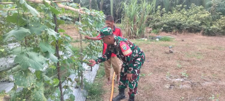 Aceh Timur – Wujud kepedulian terhadap ketahanan pangan dan kesejahteraan petani terus ditunjukkan oleh aparat kewilayahan. Serda Suyetno, Babinsa Koramil 12/Sry Kodim 0104/Aceh Timur, melaksanakan kegiatan pendampingan pertanian dalam perawatan tanaman gambas milik Sdr. M. Jafar, anggota Kelompok Tani Bantimo, dengan luas lahan 8 rante, bertempat di Desa Buket Drien, Kecamatan Sungai Raya, Kabupaten Aceh Timur. Minggu(22/02/2026).