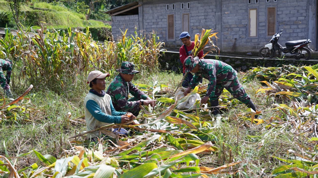 Blitar – Dalam mendukung program ketahanan pangan, anggota Satgas TNI Manunggal Membangun Desa (TMMD) Ke 127 Kodim 0808/Blitar membantu warga Dusun Barurejo Desa Krisik Kecamatan Gandusari Kabupaten Blitar panen jagung disela-sela kegiatanya, Minggu (22/2/2026)