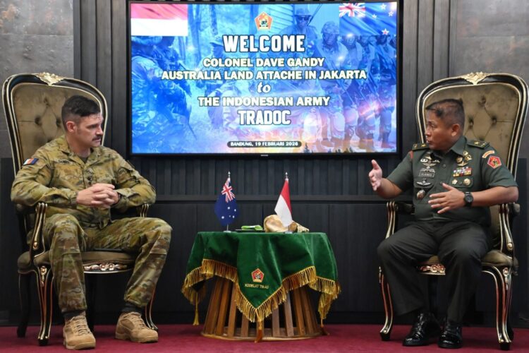 Komandan Kodiklatad Letjen TNI Mohamad Hasan yang diwakili oleh Dirlat Kodiklatad Brigjen TNI Elkines Villando Dewangga K, M.AP., menerima kunjungan Atase Angkatan Darat Australia Colonel Dave Gandy bertempat di Lounge Room Ganesha Makodiklatad.Kamis (19/2/2026).