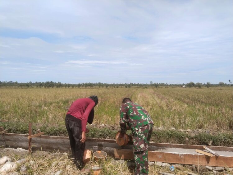 OKEBUNG –  Babinsa Koramil 04/Susoh Kodim 0110/Abdya Sertu Asrul membantu gotong royong warga membangun talut saluran pengairan di area pesawahan Desa Pinang Kecamatan Susoh, Senin (23/2/2026).