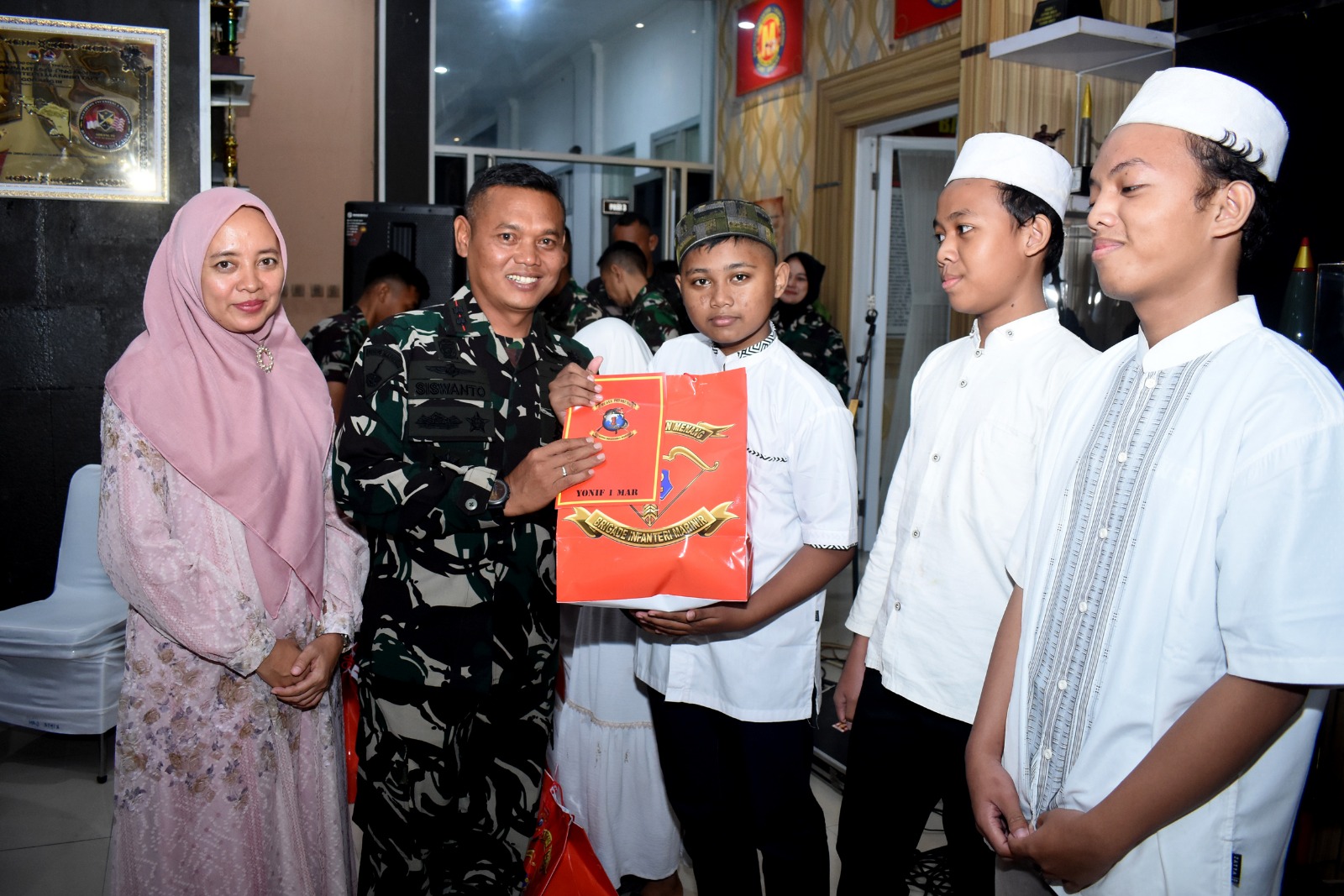Kemudian dilanjutkan pemberian paket umroh oleh Komandan Brigade Infanteri 2 Marinir kepada prajurit terbaik “Buaya Petarung” Yonif 1 Marinir, Sertu Mar Kamta kemudian pemberian santunan kepada Yayasan anak Yatim Piatu Musdalifah Waru Sidoarjo, diakhiri dengan Kultum serta buka bersama.