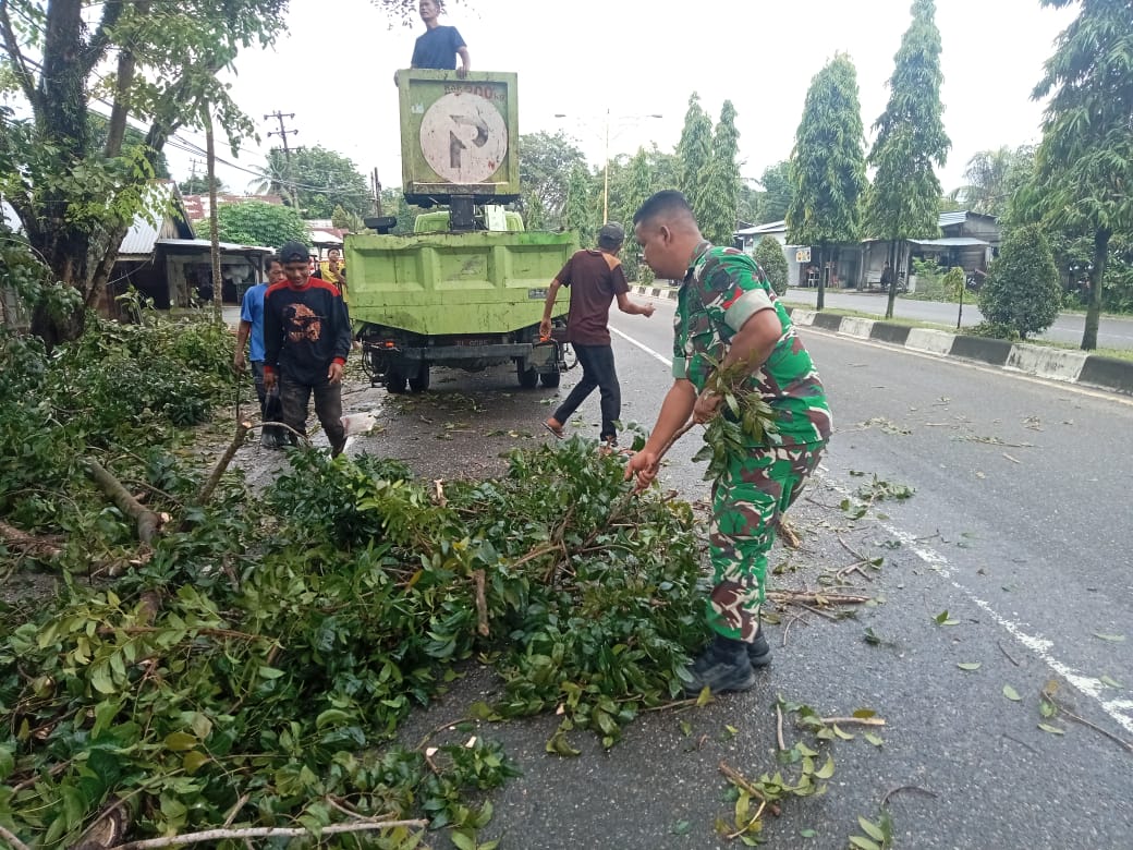 Langsa – Dalam upaya menjaga kebersihan lingkungan serta keselamatan pengguna jalan, Babinsa Koramil 02/Langsa Kodim 0104/Aceh Timur, Koptu Fery Kurniawan, melaksanakan kegiatan gotong royong bersama petugas Dinas Lingkungan Hidup dan Tata Ruang (DLH-TR) Kota Langsa dengan melakukan pemangkasan ranting pohon yang menjulur ke badan jalan, Sabtu (07/03/2026).