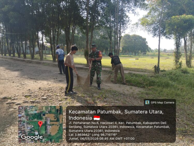 Patumbak – Babinsa dan masyarakat kembali terlihat dalam kegiatan gotong royong bersama santri pondok pesantren fazrul iman dusun VI di wilayah binaan yaitu Desa Patumbak-ll kecamatan Patumbak kabupaten Deli Serdang. Babinsa Koramil 0201-15/DT, Serka Suratman , turut serta membantu Bersih bersih di lokasi pesantren fazrul iman, pada Jumat (6/3/2026).