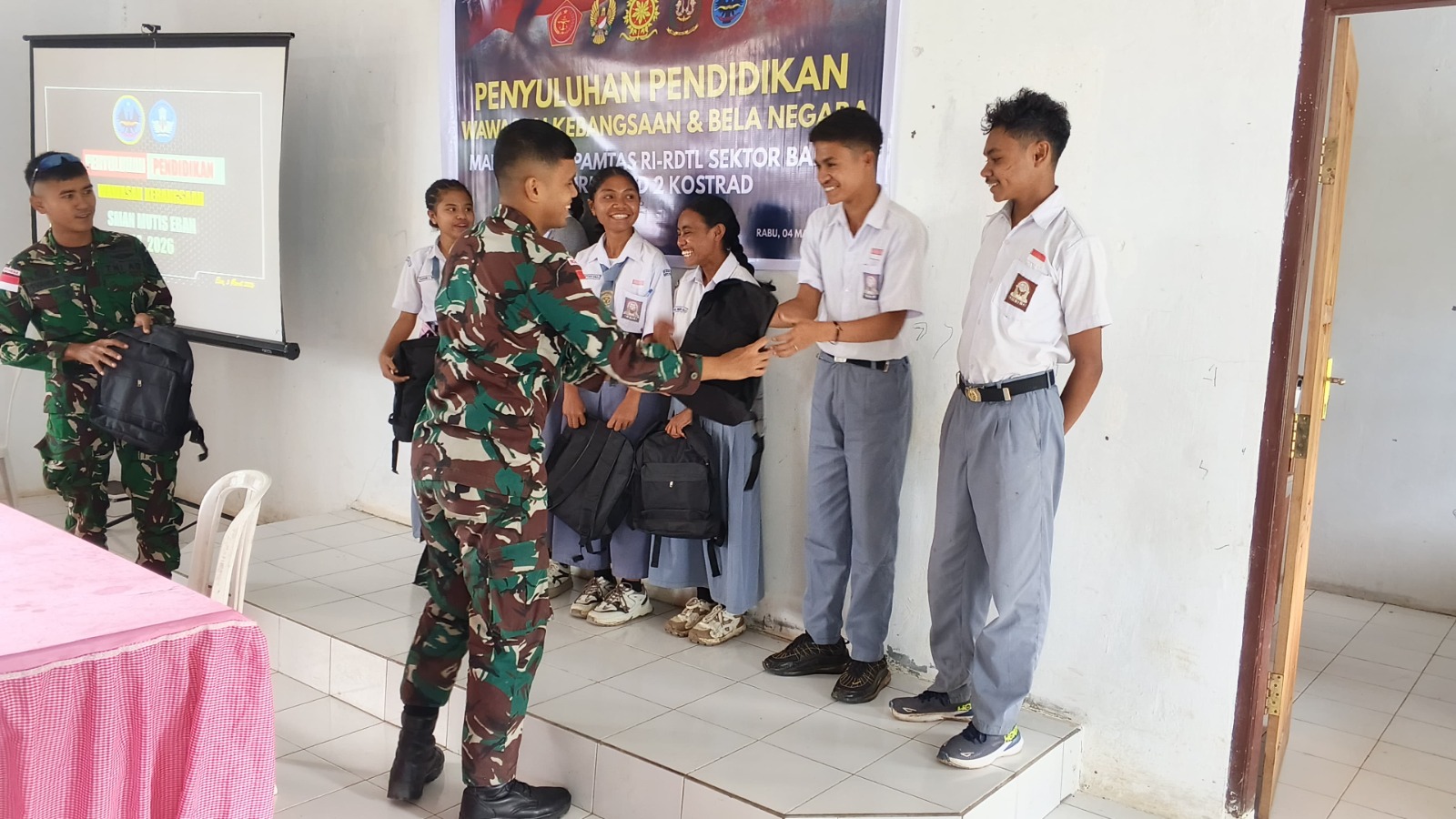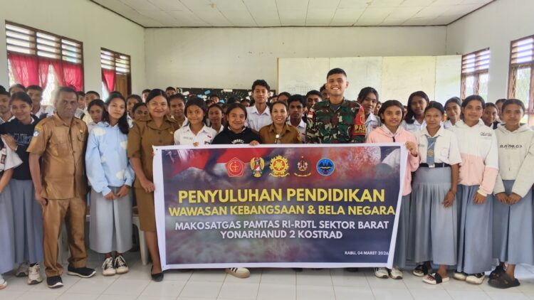 Eban – Dalam upaya meningkatkan pengetahuan generasi muda di wilayah perbatasan, personel Makosatgas Pamtas RI–RDTL Sektor Barat Yonarhanud 2 Kostrad memberikan penyuluhan pendidikan berupa materi wawasan kebangsaan dan bela negara kepada siswa-siswi SMAN Mutis, Kecamatan Miomaffo Barat, Kabupaten TTU, Jumat (06/03/2026).