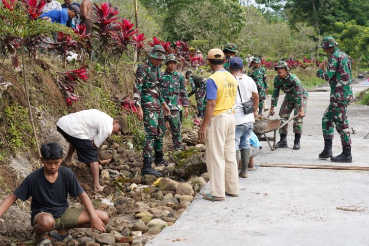 Terlihat di lapangan, para anggota Satgas TMMD Reguler ke-127 bersama warga bahu-membahu menata batu dan meratakan tanah di sisi jalan yang selesai dicor. Aktivitas ini dilakukan agar struktur bahu jalan menjadi lebih kuat dan rapi, sekaligus mencegah erosi saat musim hujan tiba.