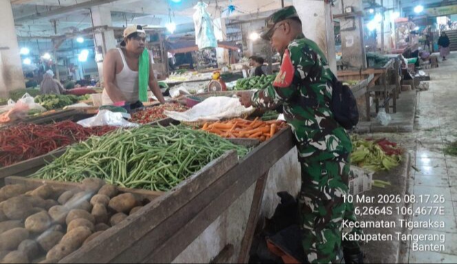 Guna memastikan pasokan bahan pokok Sembako tetap tersedia serta harga tetap stabil di pasar tradisional dan moderen,Babinsa Koramil 06/Trs Kodim 0510/Tigaraksa melakukan pengecekan dan pemantauan harga Sembako di Pasar Gudang Tigaraksa, Kabupaten Tangerang, di Jalan Arya Wangsakara RT 01/03, Kelurahan Tigaraksa, Kecamatan Tigaraksa, Selasa pagi (10/3/2026).
