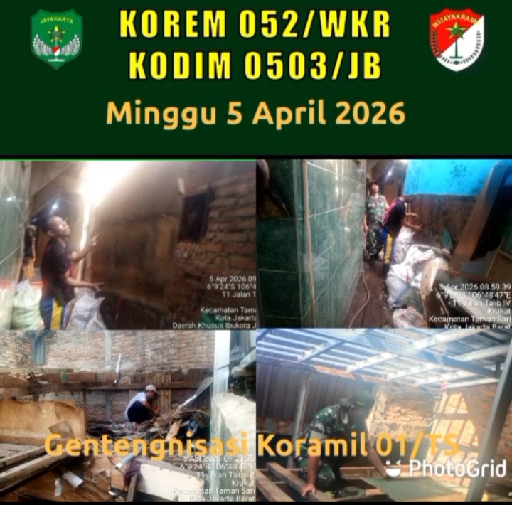 Hari libur minggu pekerjaan rehab rumah tidak layak huni (RTLH) Gentengisasi di wilayah Kodim 0503/JB terus digenjot pekerjaannya,Minggu, 05 April 2026 dimulai pukul 08.00 Wib. Hari ini kedua rehab Gentengisasi telah menunjukan hasil memuaskan.