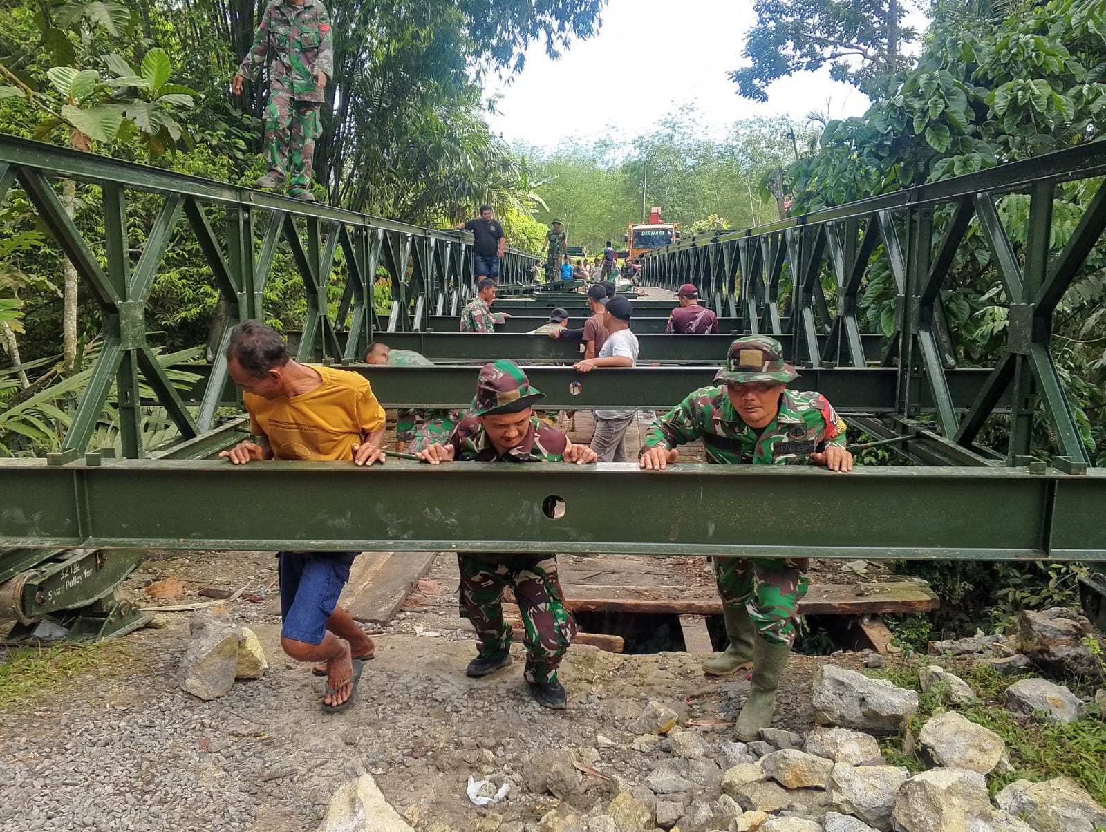 Adapun tahapan pekerjaan meliputi pembersihan dan persiapan lahan, pembongkaran material jembatan dari kendaraan, perambuan, perakitan material jembatan modular, pembuatan dudukan pelat dasar, pembangunan pondasi batu, pengecoran, hingga pengecatan sebagai tahap akhir penyelesaian.