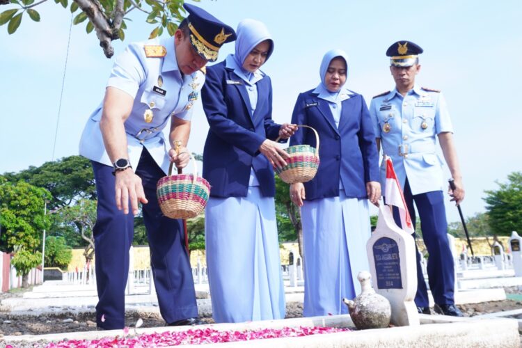 MADIUN, LANUD ISWAHJUDI. Menjelang peringatan HUT Ke-80 TNI Angkatan Udara, Danlanud Iswahjudi Marsma TNI Muchtadi Anjar Legowo, M.S., M.Han., memimpin ziarah di Taman Makam Pahlawan (TMP) Madiun. Rabu (8/4/2025).