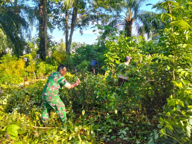 OKEBUNG – Babinsa Koramil 07/Babahrot Kodim 0110/Abdya Koptu Johan bersama warga melaksanakan kegiatan gotong royong membersihkan Tempat Pemakaman Umum (TPU) di Desa Ie Mirah, Kecamatan Babahrot, Sabtu (11/4/2026).