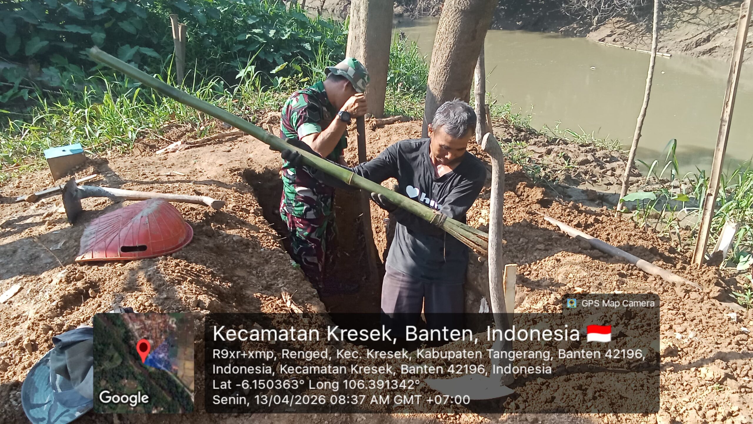 Hari ini,Senin 13 April 2026 pekerjaan pembangunan jembatan yang dikerjakan prajurit TNI dan warga sedang melanjutkan pekerjaan perakitan besi behel tiang,dan pengecoran tiang .