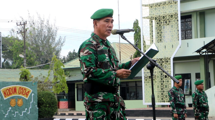 Langsa – Kodim 0104/Aceh Timur menggelar upacara bendera mingguan yang berlangsung khidmat di Lapangan Hitam Makodim 0104/Atim, Jl. Jenderal Ahmad Yani, Desa Paya Bujok Seuleumak, Kecamatan Langsa Baro, Kota Langsa, Senin (13/04/2026).
