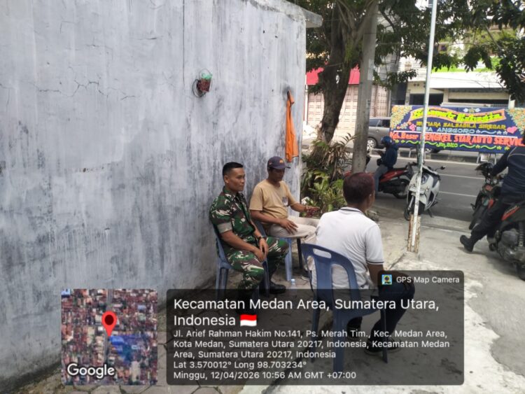 Medan Area – Dalam menjalin komunikasi antara aparat Komando Kewilayahan dengan masyarakat bisa dilakukan di mana saja. Seperti yang dilakukan Babinsa Koramil 0201-04/MK, Sertu Indra Putra Maha melakukan Komunikasi Sosial (Komsos) dengan juru Parkir bertempat di Jl. Arief Hakim No.141 Kel.Pasar Merah Timur, Kec . Medan Area Minggu, (12/4/2026).