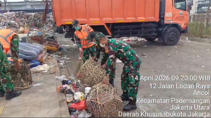 Dalam rangka mencegah berjangkitnya penyakit disebabkan dari sampah,dan sebagai wujud menciptakan lingkungan sehat dan bersih,Satgas Sampah Kodim 0502/JU bersama petugas PPSU,Wanra,dan warga kembali melaksanakan aksi bersih-bersih di TPS yang ada di Jalan Lodan Raya RT 07/02 Kelurahan Ancol Kecamatan Pademangan,Selasa 14 April 2026.