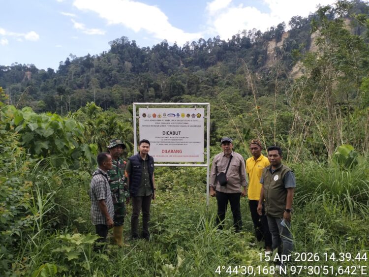 Aceh Timur — Langkah tegas pemerintah dalam menertibkan kawasan hutan kembali ditunjukkan hingga ke pelosok negeri. Rabu (15/4/2026), Satuan Tugas Penertiban Kawasan Hutan (Satgas PKH) bersama aparat lintas instansi melakukan pengecekan sekaligus memastikan pemasangan pamflet/plang terkait pencabutan izin lahan milik PT Rimba Timur Sentosa (RTS) di Dusun Sijuk, Desa Sijudo, Kecamatan Pantee Bidari.