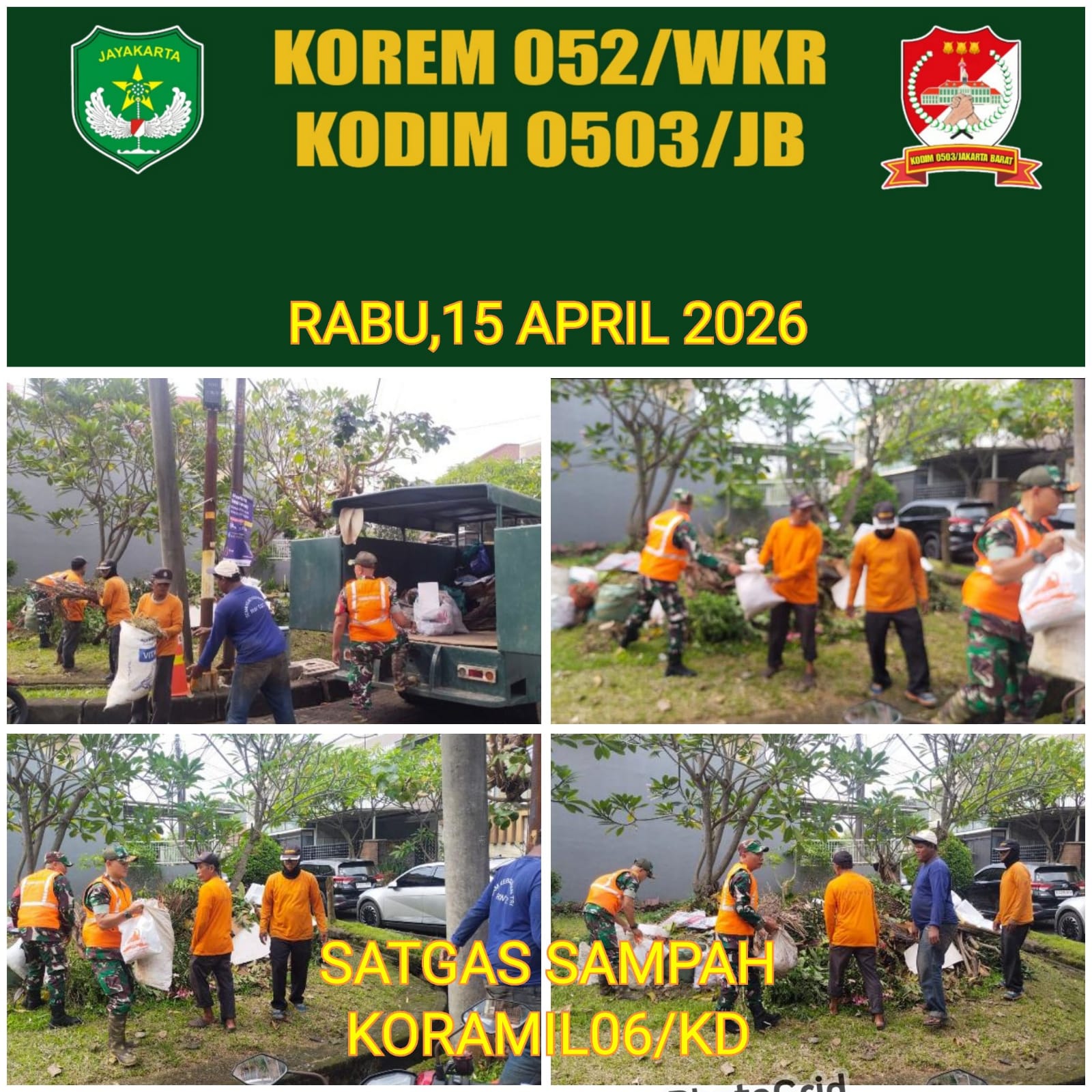 Hari ini puluhan personel dari jajaran Koramil Kodim 0503/JB bergerak mulai dari pagi,Rabu 15 April 2026.Dengan berbekal perangkat kerja seadanya mereka bekerjasama dengan Komduk dengan semangatnya mengangkati sampah-sampah dipinggir jalan,tempat pembuangan sampah warga ,dan kali .