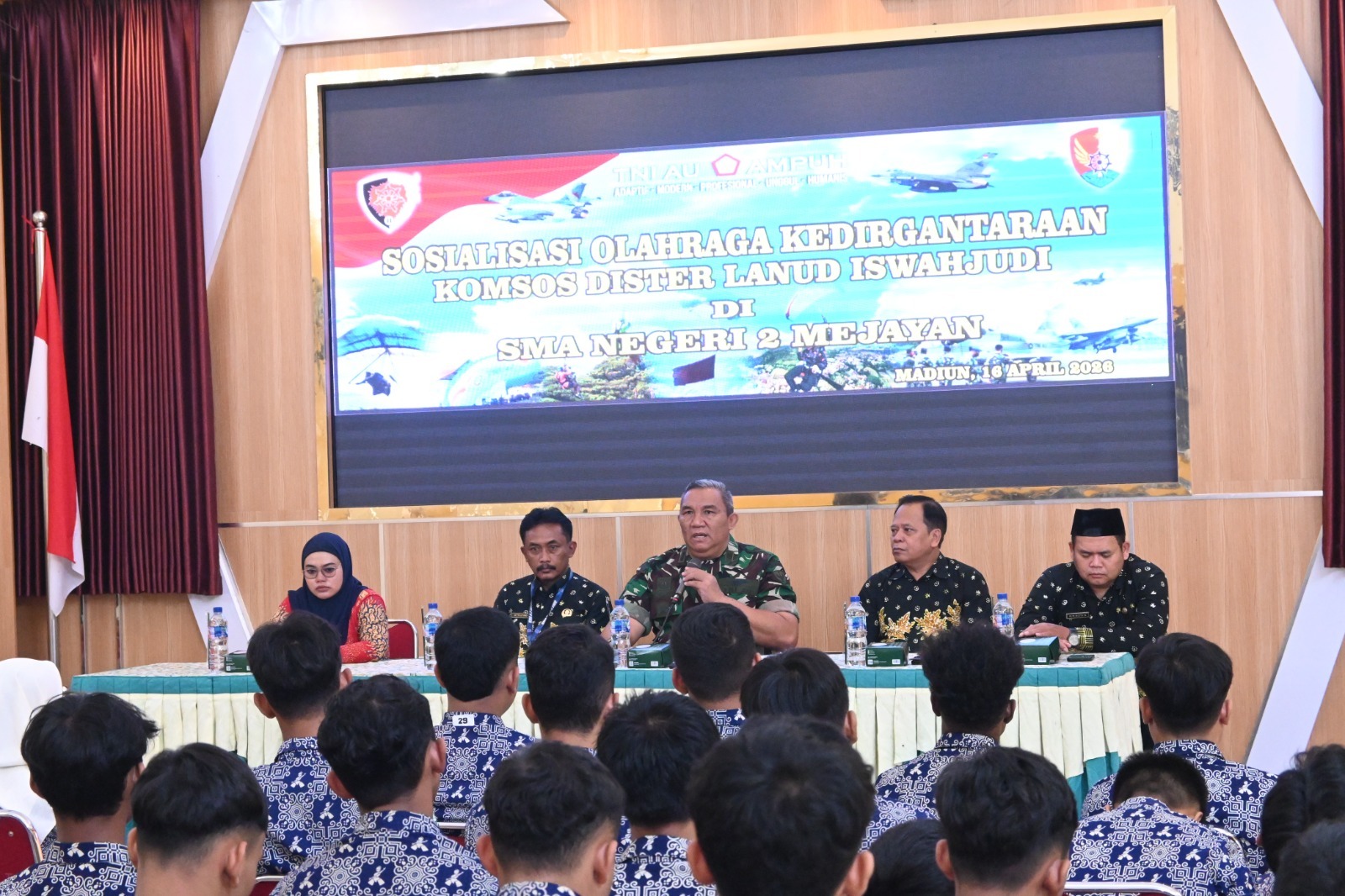 MADIUN, LANUD ISWAHJUDI. Mengenalkan olahraga dirgantara kepada generasi muda, Lanud Iswahjudi menggelar sosialisasi di SMA Negeri 2 Mejayan. Kedatangan Kasitahwildirga Dister Lanud Iswahjudi Letkol Adm M. Teguh, S.E., beserta tim sosialisasi diterima secara langsung oleh Kepala Sekolah Bapak Setyo Utomo, S.Pd., M.Pd., di Ruang Aula SMA Negeri 2 Mejayan, Kabupaten Madiun. Kamis (16/4/2026).