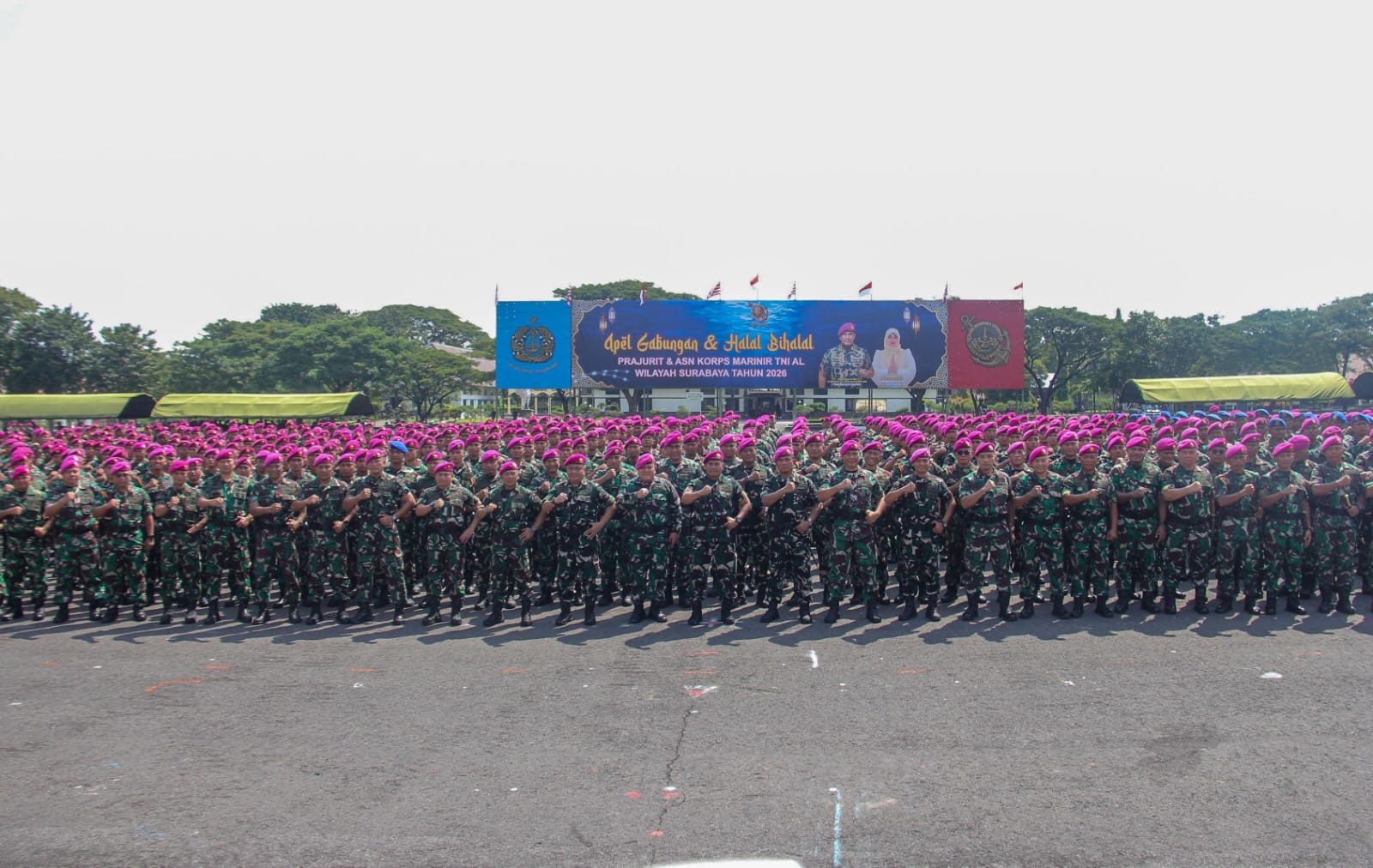 Dispen Kormar TNI Angkatan laut (Surabaya). Kolonel Marinir Dr. Iwan Permana, S.H., M.Tr.Opsla., didamping Ketua Cabang 5 Korcab Pasmar 2 Jalasenastri Korps Marinir bersama Pejabat Utama Menkav 2 Mar dan segenap prajurit serta ASN mengikuti apel gabungan dan halal bihal seluruh Marinir wilayah Kotama Surabaya yang dipimpin langsung Panglima Korps Marinir (Pangkormar) Letnan Jenderal TNI (Mar) Dr. Endi Supardi, S.E., M.M., M.Tr.Opsla., CHRMP., CRMP., di lapangan apel Ksatrian Soetedi Senaputra Karangpilang Surabaya. Kamis (16/04/2026).