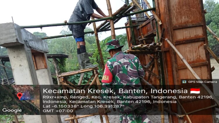 Di sisi tepi jauh, progres pembangunan mulai bergerak dengan pengecoran tiang yang dilakukan oleh tiga prajurit TNI,dibantu 5 orang warga.
