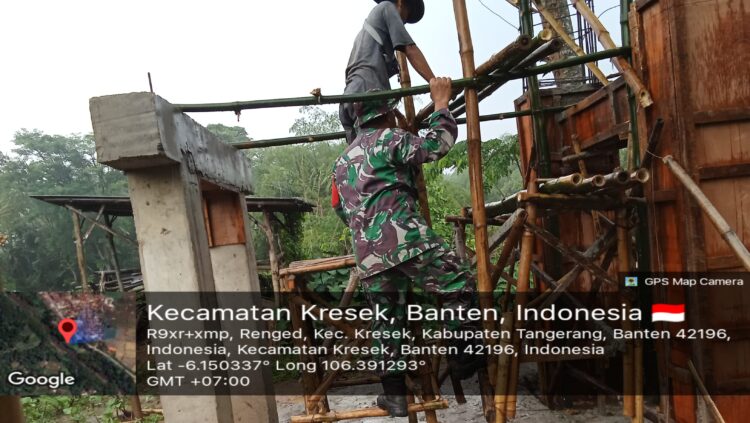 Di sisi tepi jauh, progres pembangunan mulai bergerak dengan pengecoran tiang yang dilakukan oleh tiga prajurit TNI,dibantu 5 orang warga.