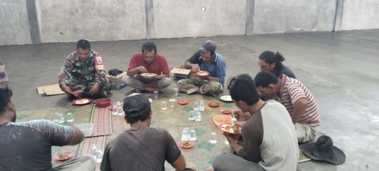 Di sela kegiatan pengawasan, suasana hangat tercipta saat Babinsa dan kepala desa memilih makan siang bersama para pekerja bangunan. Momen tersebut dimanfaatkan sebagai ajang komunikasi santai namun produktif, membahas perkembangan pekerjaan yang kini telah mencapai 79,63 persen. Hadir pula Kepala Tukang Syahya Capah serta Ketua Pemuda Erwin Banurea yang turut berbaur dalam kebersamaan tersebut.