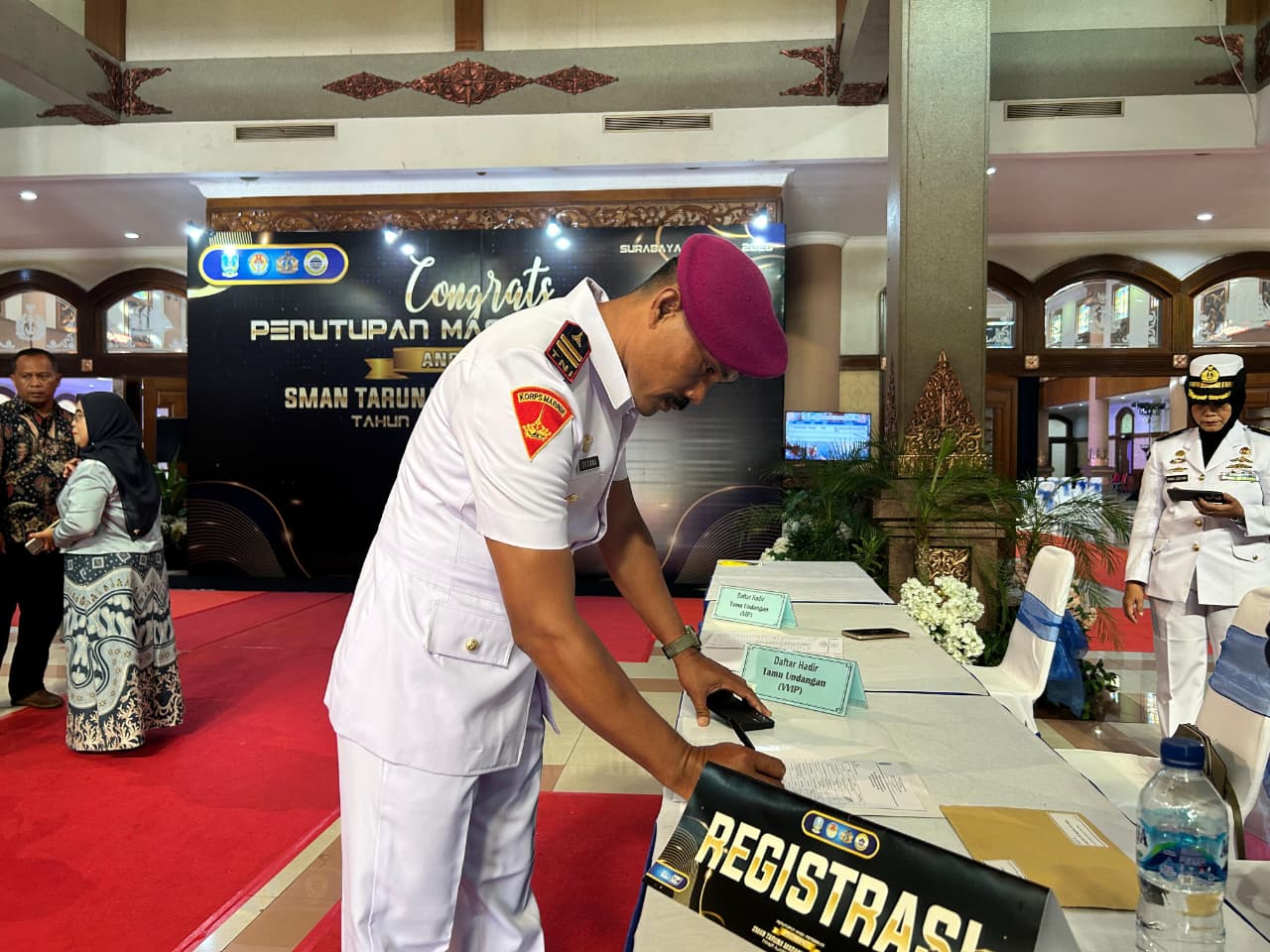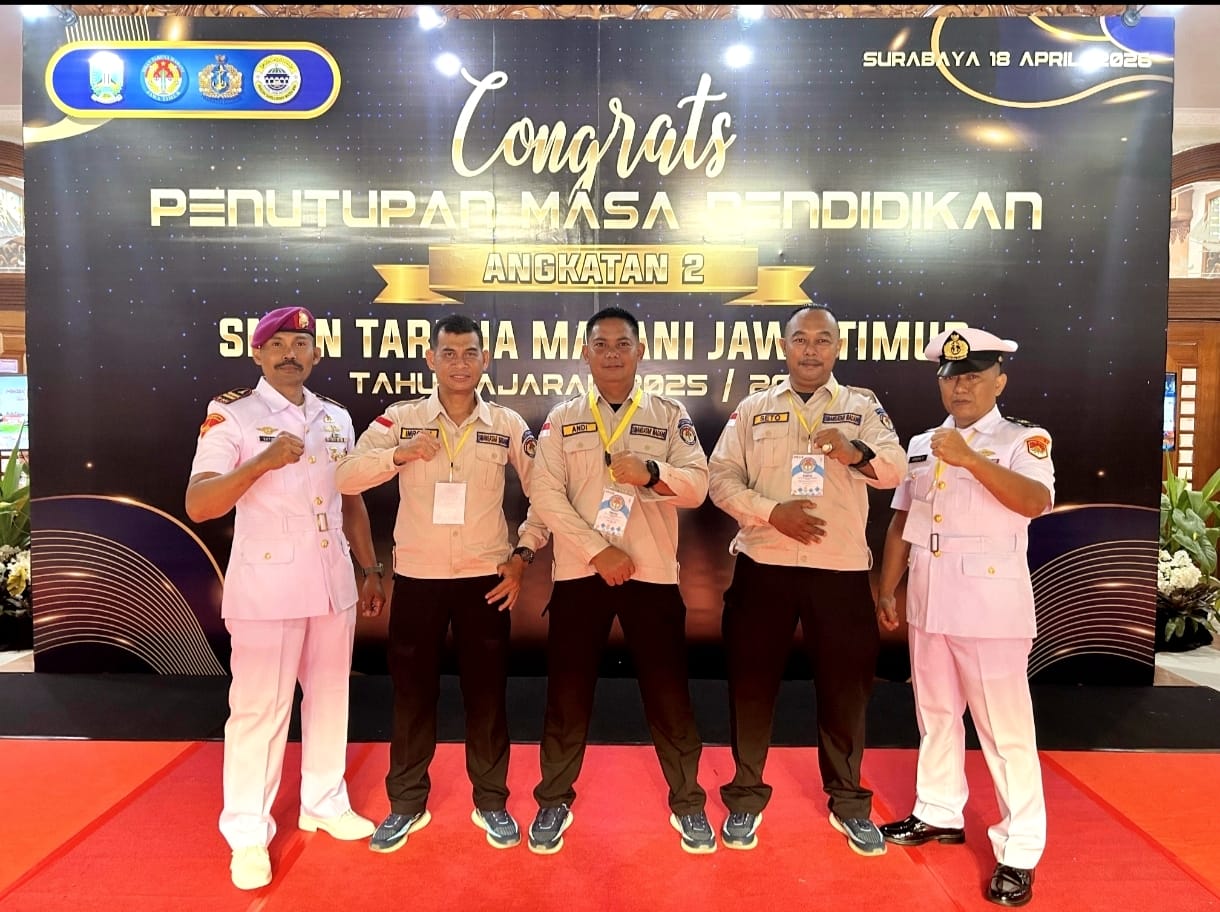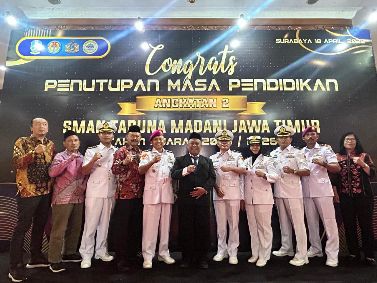 TNI AL. Dispen Kormar. Kolatmar. (Surabaya). Pusat Latihan Pertempuran Marinir 3 Grati (Puslatpurmar 3 Grati) menunjukkan komitmennya dalam mendukung pembinaan generasi muda melalui kehadiran dalam kegiatan Penutupan Masa Pendidikan Angkatan 2 SMA Negeri Taruna Madani Jawa Timur Tahun Ajaran 2025/2026 yang digelar di Gedung Graha Samudra, Bumimoro, Surabaya. Sabtu (18/4/2026).
