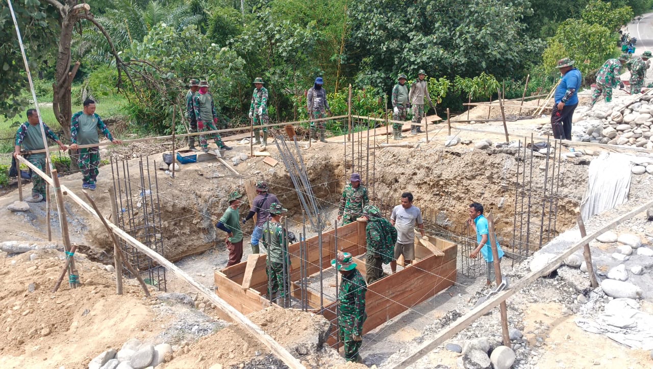 Danposramil Darul Hasanah, Peltu Dedi Cahyadi, menyampaikan bahwa proses pembangunan terus dipacu agar segera memasuki tahap berikutnya. “Pekerjaan ini kami kebut agar akses masyarakat segera pulih, dengan tetap memastikan seluruh tahapan berjalan aman dan sesuai standar,” ujarnya.