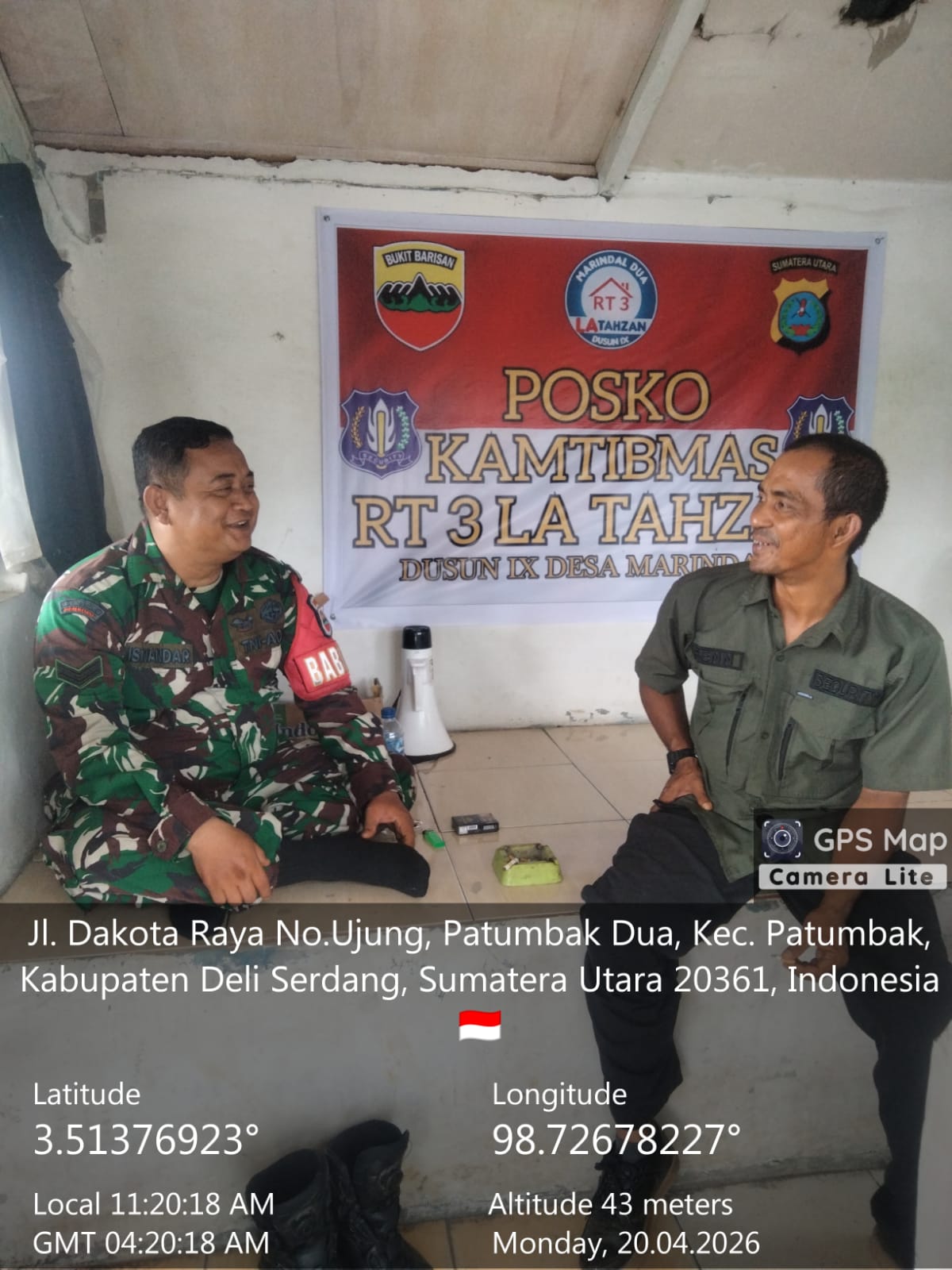 Patumbak- Babinsa Koramil 15/DT Kodim 0201Medan Sertu Adesmar Komsos bersama warga jaga Kamtibmas dan kebersihan lingkungan di Desa Lantasan Baru Kecamatan Patumbak Kabupaten Deli Serdang Sumut.