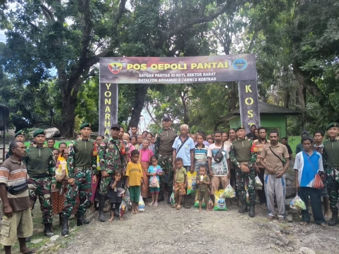 Natemnanu – Satgas Pamtas RI–RDTL Sektor Barat dari Yonarhanud 2 Kostrad Pos Oepoli Pantai melaksanakan kegiatan sosial dengan membagikan 150 paket sembako dan 150 paket snack kepada masyarakat yang membutuhkan di Desa Natemnanu Utara, Kecamatan Amfoang Timur, Kabupaten Kupang, Sabtu (18/04/2026).