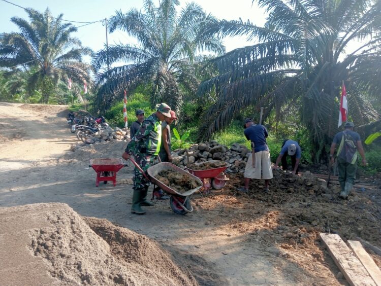 Kegiatan ini dilakukan karena kondisi jalan yang selama ini digunakan masyarakat untuk mengangkut hasil panen mengalami kerusakan, sehingga menyulitkan akses transportasi, khususnya bagi para petani. Dengan penuh semangat kebersamaan, Babinsa bersama warga bahu-membahu menimbun jalan agar dapat kembali dilalui dengan aman dan lancar.