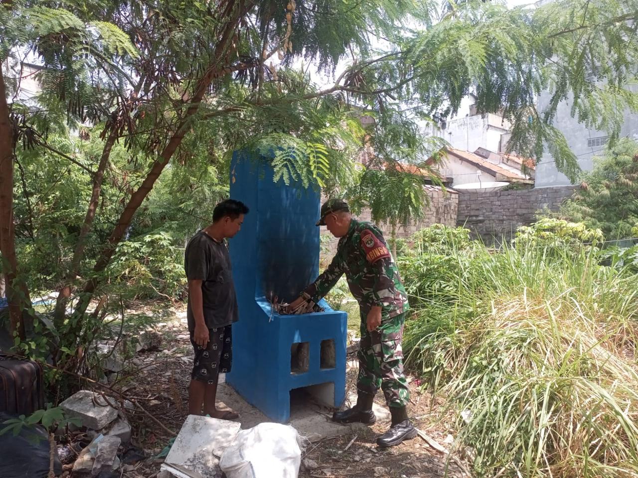 Kodim 0503/JB jajaran menunjukkan kepeduliannya untuk menjaga lingkungan dengan membakar sampah mengunakan Insinerator sebagai alat