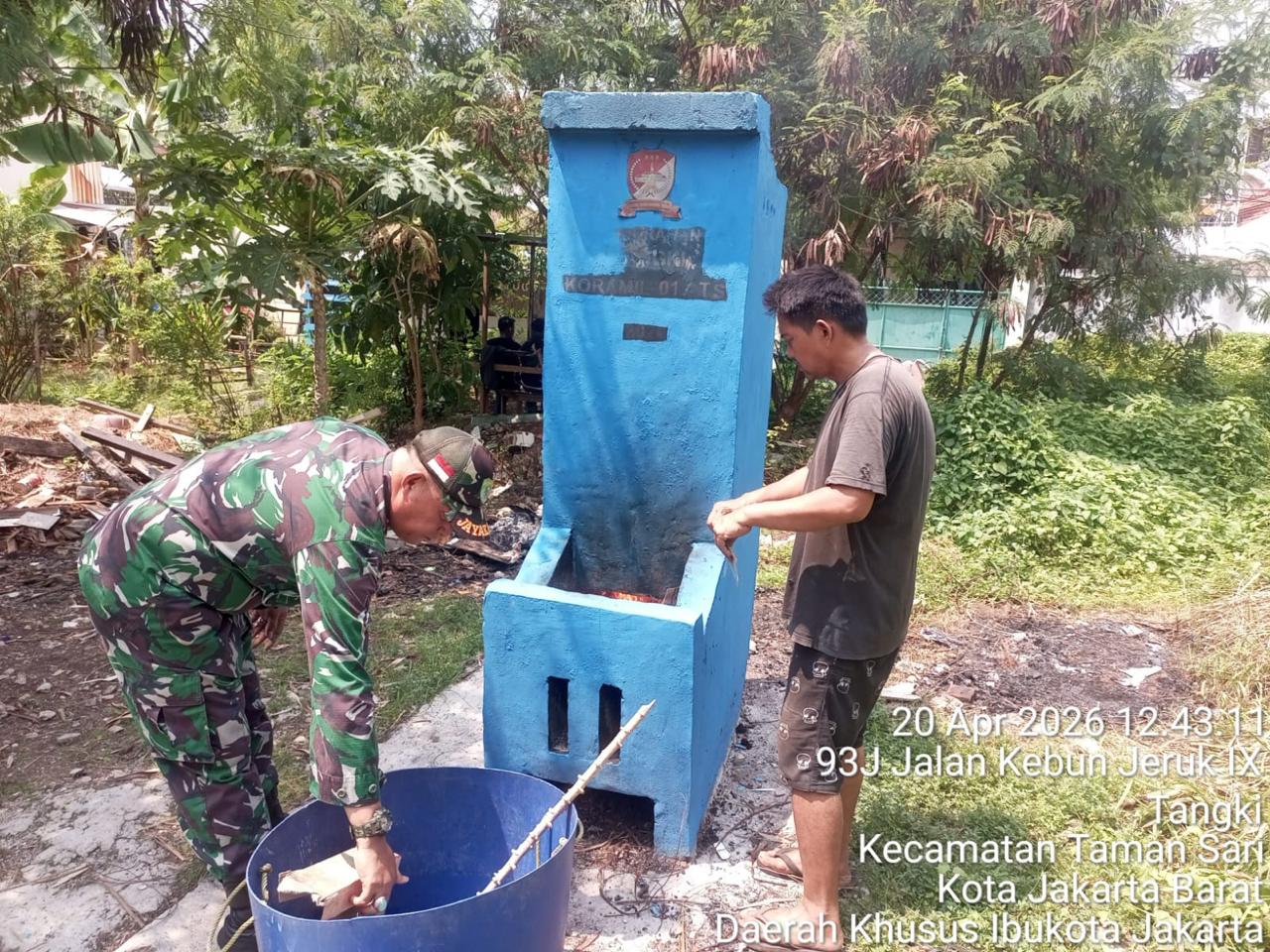 Guna mengurangi volume sampah dan menciptakan ramah lingkungan,personel Babinsa Kodim 0503/JB bersama warga membakar sampah menggunakan alat Incinerator,Senin 20 April 2026,bertempat di wilayah Koramil 01/TS.