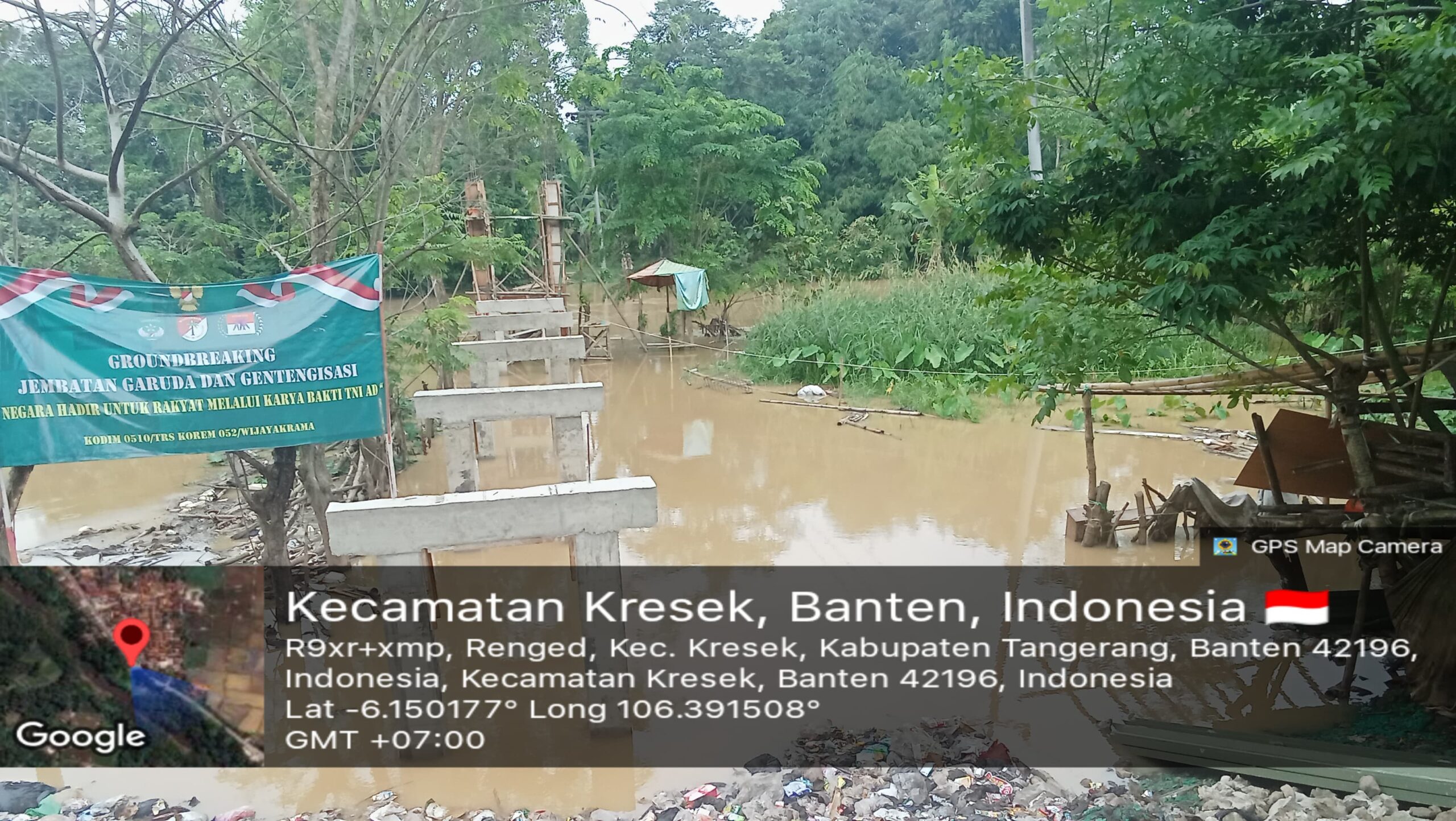 Terlihat progres pembangunan mulai kelihatan hasilnya,tiang beton kokoh berdiri dikerjakan oleh tiga prajurit TNI,dibantu 5 orang warga.Semua pekerjaan lancar dan langsir material juga terus dilakukan guna memastikan kelancaran setiap tahapan konstruksi pembangunan jembatan yang nantinya diperuntukan untuk 114 warga masyarakat dan 37 jiwa yang terisolasi di wilayah Kp. Dukuh Rt. 012/004 Ds.Patrasana ,Kec. Kresek Kab. Tangerang .