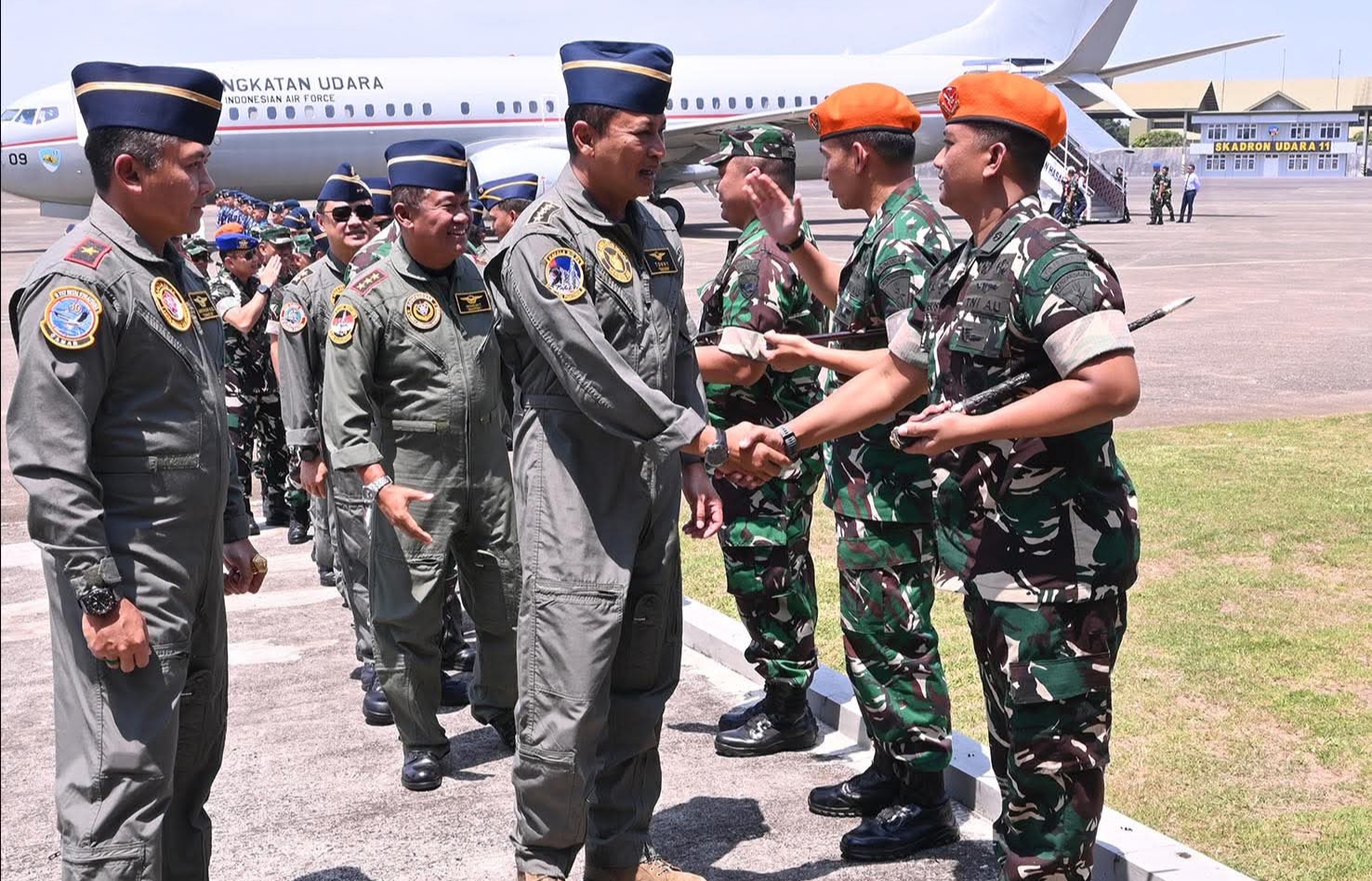 Kedatangan Kasau beserta rombongan disambut langsung oleh Komandan Lanud Sultan Hasanuddin Marsma TNI Arifaini Nur Dwiyanto, M.Han., di Apron Base Ops Lanud Sultan Hasanuddin.
