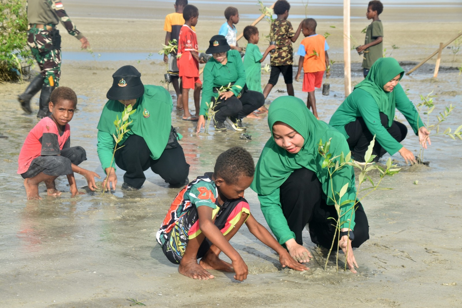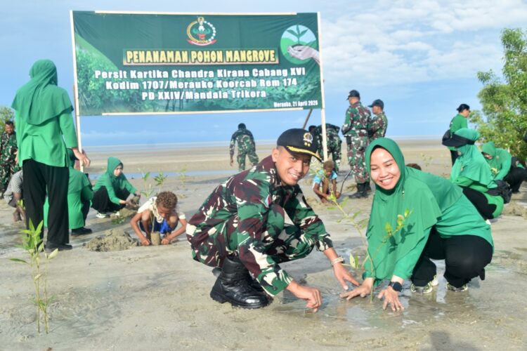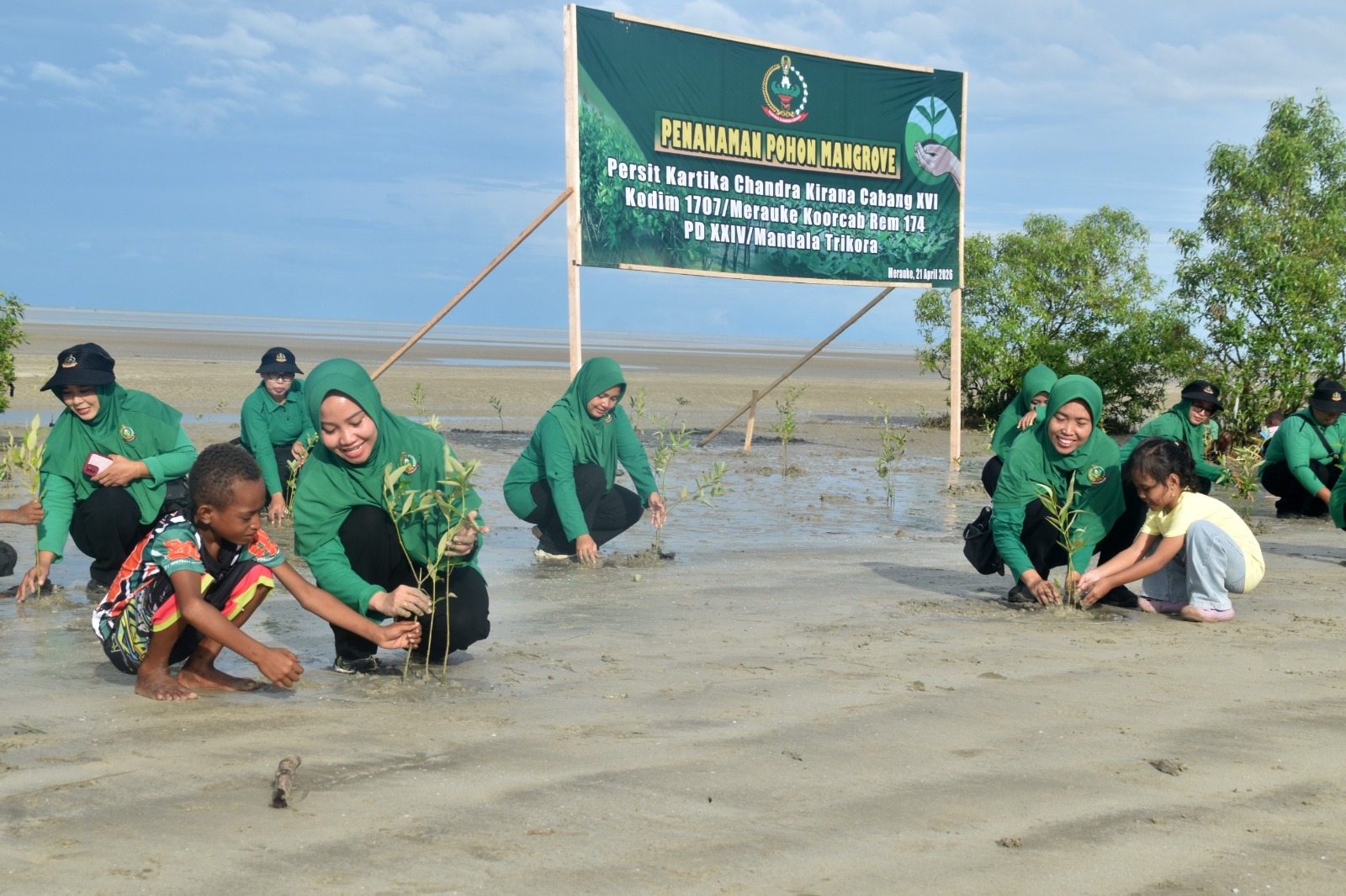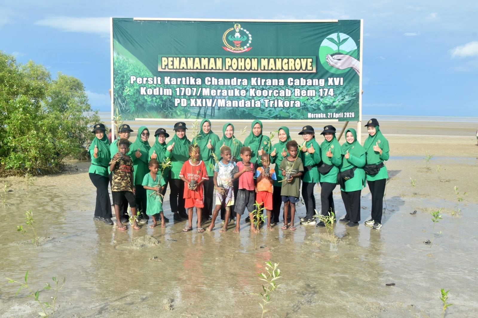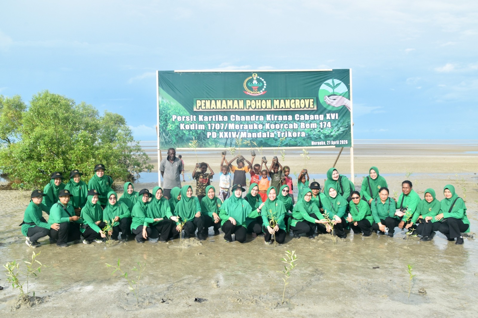 Aksi nyata kepedulian terhadap lingkungan kembali ditunjukkan oleh Persit Kartika Chandra Kirana Cabang XVI Kodim 1707/Merauke Koorcab Rem 174 PD XXIV/Mandala Trikora melalui kegiatan penanaman pohon mangrove yang berlangsung di Pantai Payum, Kelurahan Samkai, Distrik Merauke, Kab. Merauke – Provinsi Papua Selatan, pada Selasa pagi (21/04/2026). Kegiatan dipimpin langsung oleh Ketua Persit Ny. Asti Dili Eko Setyawan didampingi Dandim 1707/Merauke Letkol Czi Dili Eko Setyawan, S.Ak., M.Han.
