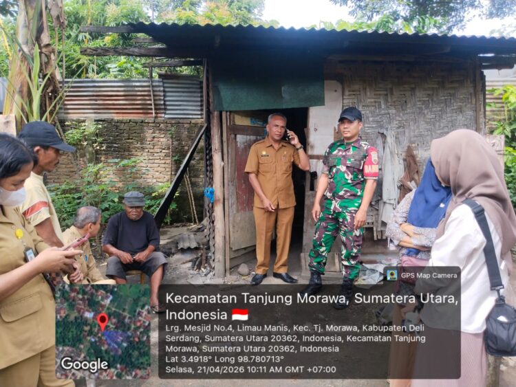 Tanjung Morawa – Babinsa Desa Bangun Rejo Koramil 0201-16/TM ,Serda Yusran melaksanakan monitoring kegiatan kunjungan Camat Tanjung Morawa dalam rangka peninjauan langsung kondisi gubuk tidak layak huni milik Bapak Ngatemin yang viral di media sosial melalui akun Alika26. Kegiatan berlangsung di Dusun 4, Gang Masjid, Desa Bangun Rejo, Kecamatan Tanjung Morawa, Kabupaten Deli Serdang, Selasa (21/04/2026).