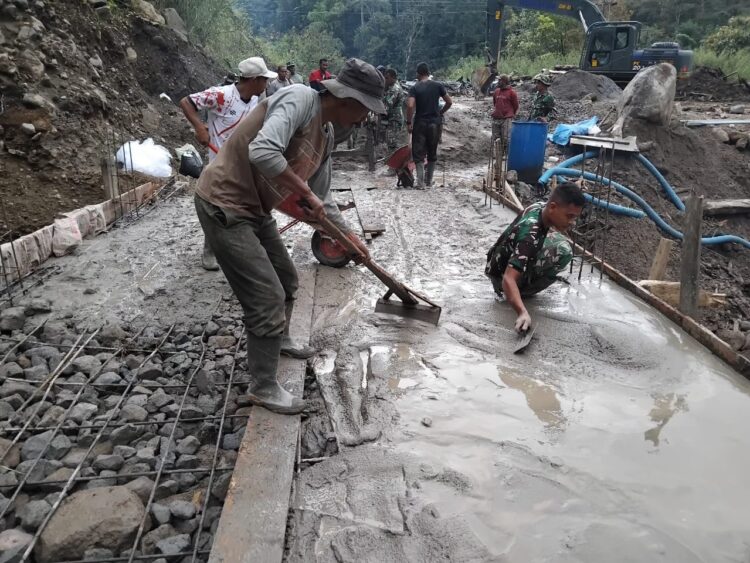 BENER MERIAH, tniad.mil.id – Pembangunan Jembatan Armco di Desa Uning Mas, Kecamatan Pintu Rime Gayo, Kabupaten Bener Meriah terus menunjukkan progres positif. Dikerjakan secara gotong royong oleh personel TNI bersama masyarakat, pembangunan kini memasuki tahap pengecoran lantai sebagai bagian krusial dalam penyelesaian konstruksi, Senin (20/4/2026).