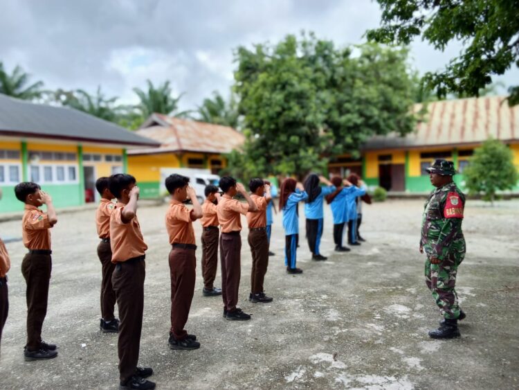 OKEBUNG – Babinsa Koramil 07/Babahrot Kodim 0110/Abdya, Serma Novriyandi, memberikan pelatihan dan bimbingan Peraturan Baris Berbaris (PBB) kepada siswa SMA Negeri 7 Babahrot di Desa Pantee Rakyat, Kecamatan Babahrot, Rabu (22/4/2026).