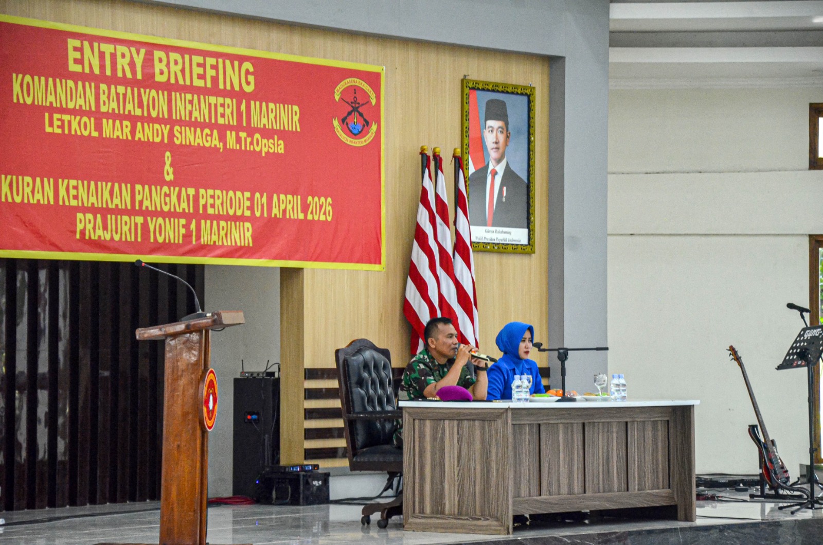 Dispen Kormar, TNI Angkatan Laut (Sidoarjo) Mengawali kepemimpinannya sebagai Komandan Batalyon Infanteri 1 Marinir Letkol Marinir Andy Sinaga, M.Tr.Opsla didampingi Ketua Ranting B Cabang 2 Korcab Pasmar 2 Ny. Reni Andy Sinaga melaksanakan Entry Briefing di Gedung Balai Prajurit (Bapra) Edianto Brigif 2 Marinir, Gedangan, Sidoarjo, Jawa Timur. Senin (20/04/2026)