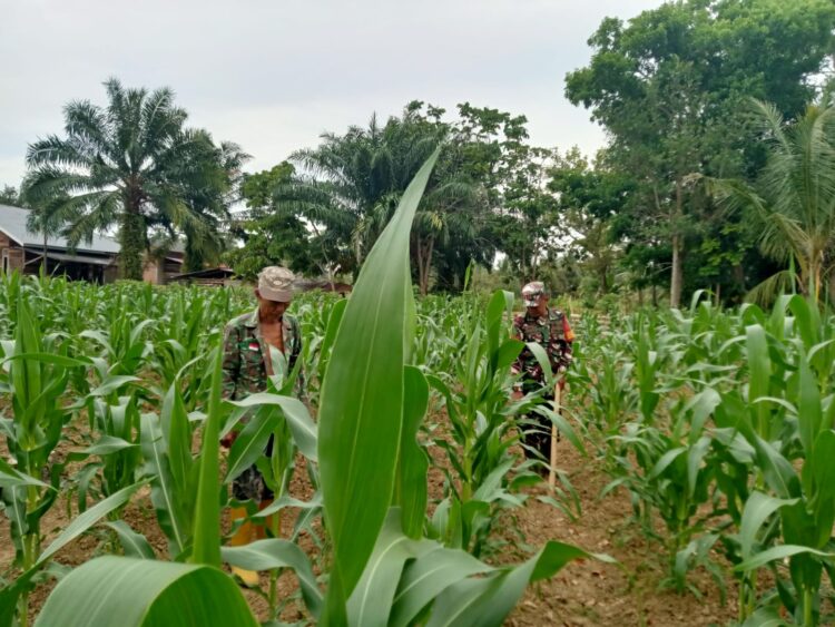 Aceh Timur – Kopka Bambang Pramono, Babinsa Koramil 04/Plk Kodim 0104/Aceh Timur, turun langsung ke lapangan membantu petani melaksanakan perawatan lahan jagung di Desa Tualang, Kecamatan Peureulak, Kabupaten Aceh Timur, Kamis 23 April 2026.