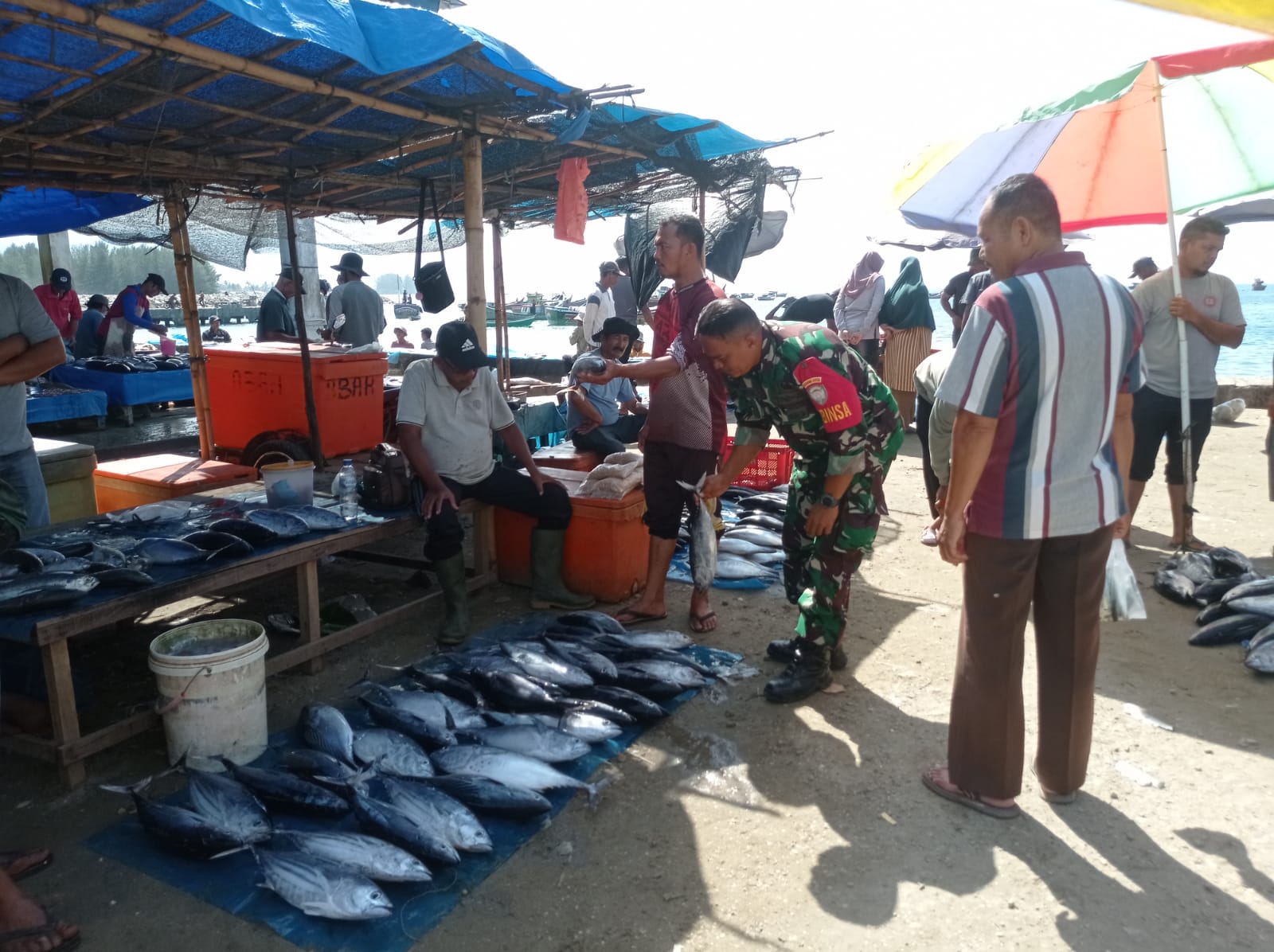 Dalam pemantauannya, Serka Joni Warman berinteraksi langsung dengan para nelayan dan pedagang guna memperoleh informasi terkait harga jual ikan, hasil tangkapan, serta kendala yang dihadapi di lapangan.