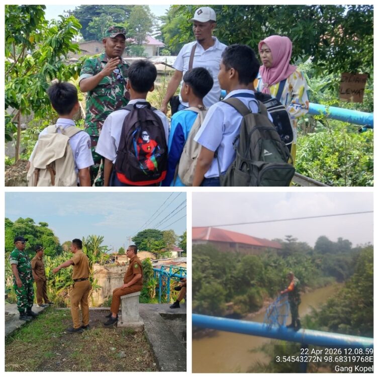 MEDAN 05/MB | Disinyalir masih ada anak sekolah yang menapaki saluran pipa air PDAM yang melintas di aliran Sungai Deli yang menghubungkan antara Kecamatan Medan Maimun dan Medan Polonia, Babinsa langsung turun tangan demi mencegah jatuhnya korban, siswa sekolah diimbau tak lagi melintas pipa air tersebut.