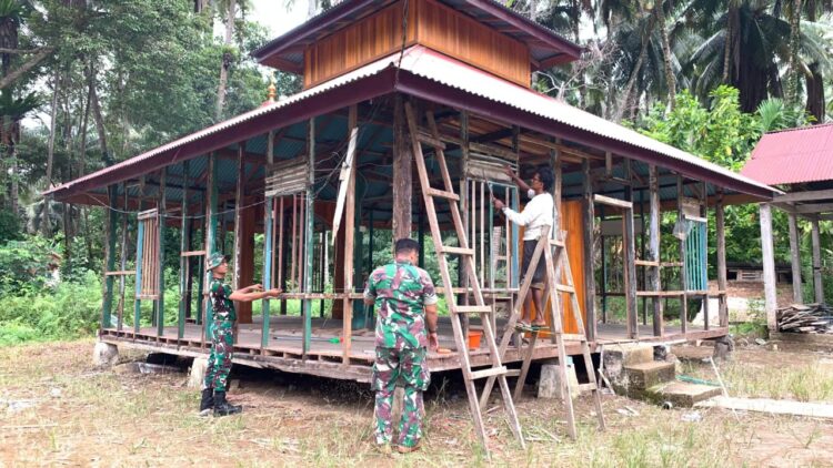 Anggota Satgas TMMD bersama warga setempat tampak bergotong royong mengerjakan berbagai bagian mushola, mulai dari perbaikan atap, dinding, hingga pengecatan. Kebersamaan antara TNI dan masyarakat terlihat begitu kuat dalam setiap tahapan pekerjaan, mencerminkan semangat kemanunggalan yang menjadi tujuan utama program TMMD.