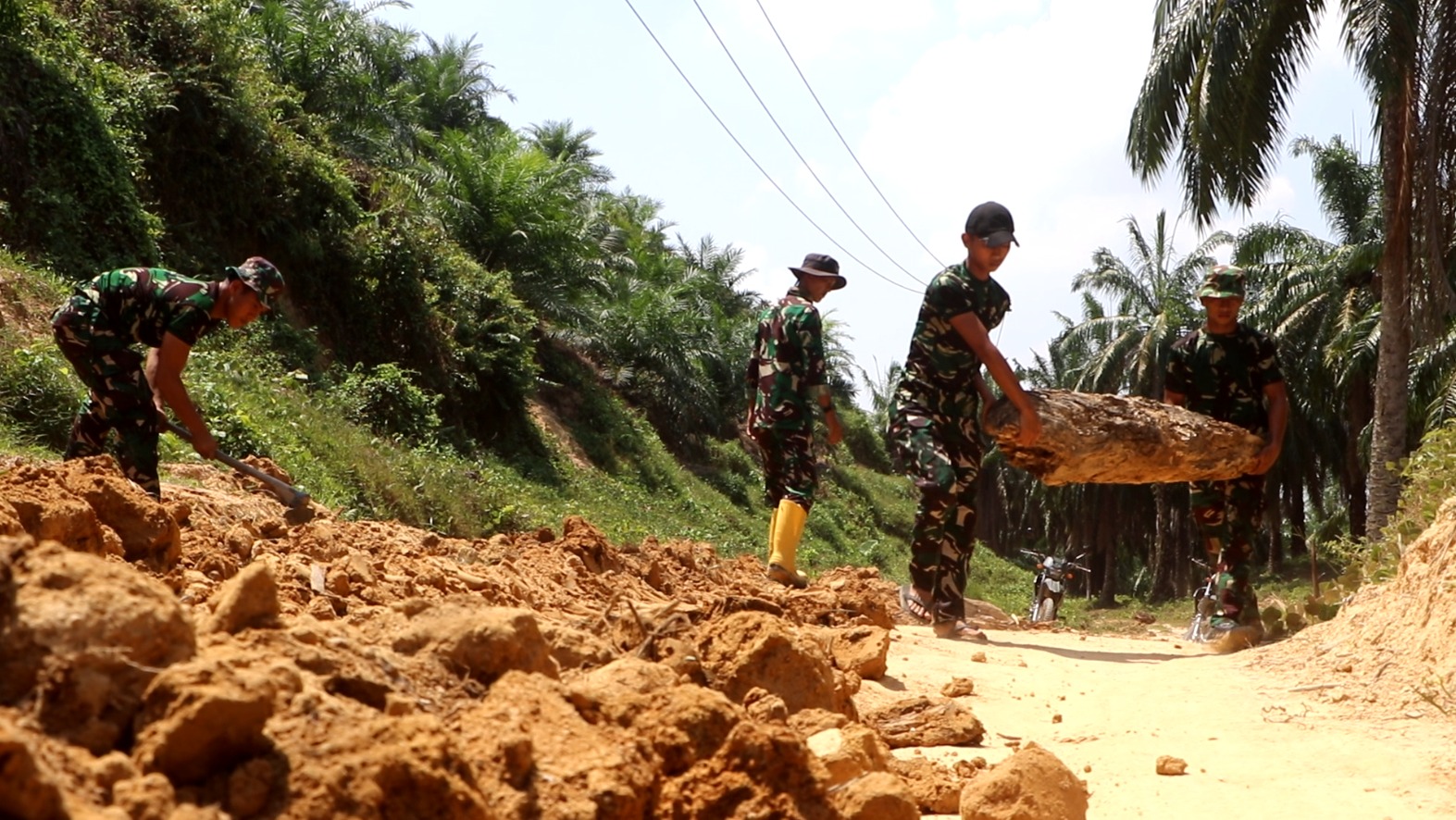 Di lokasi, terlihat alat berat bekerja tanpa henti meratakan badan jalan. Tidak hanya itu, personel Satgas TMMD juga turut berjibaku membersihkan puing-puing kayu dan balok yang menghambat proses pengerjaan, demi memastikan jalur siap untuk tahap pengerasan selanjutnya.